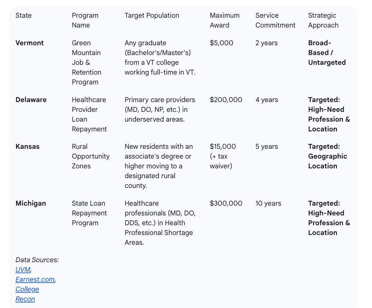 Targeted vs. Broad: Most state programs are highly targeted at specific, high-need professions. For example, Delaware offers up to $200,000 for healthcare providers, according to a review by Earnest.com, and reporting from College Recon shows Michigan offers up to $300,000 for medical professionals in shortage areas. These programs use large incentives to fill specific, critical gaps.