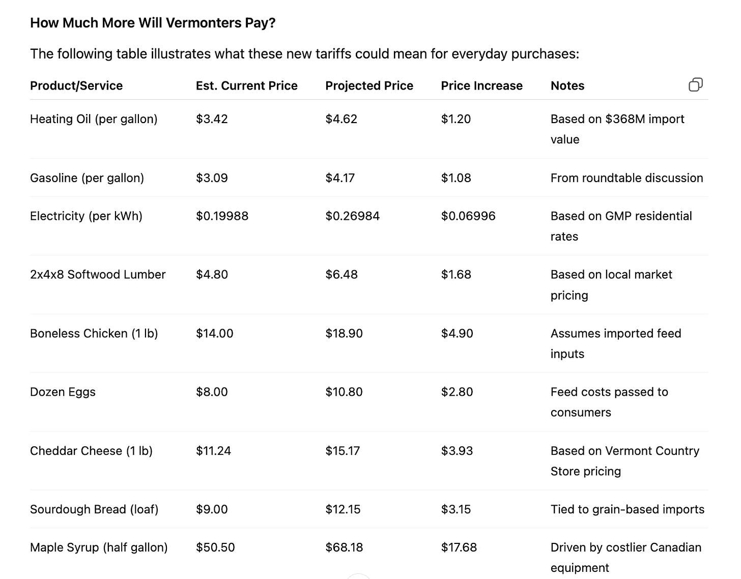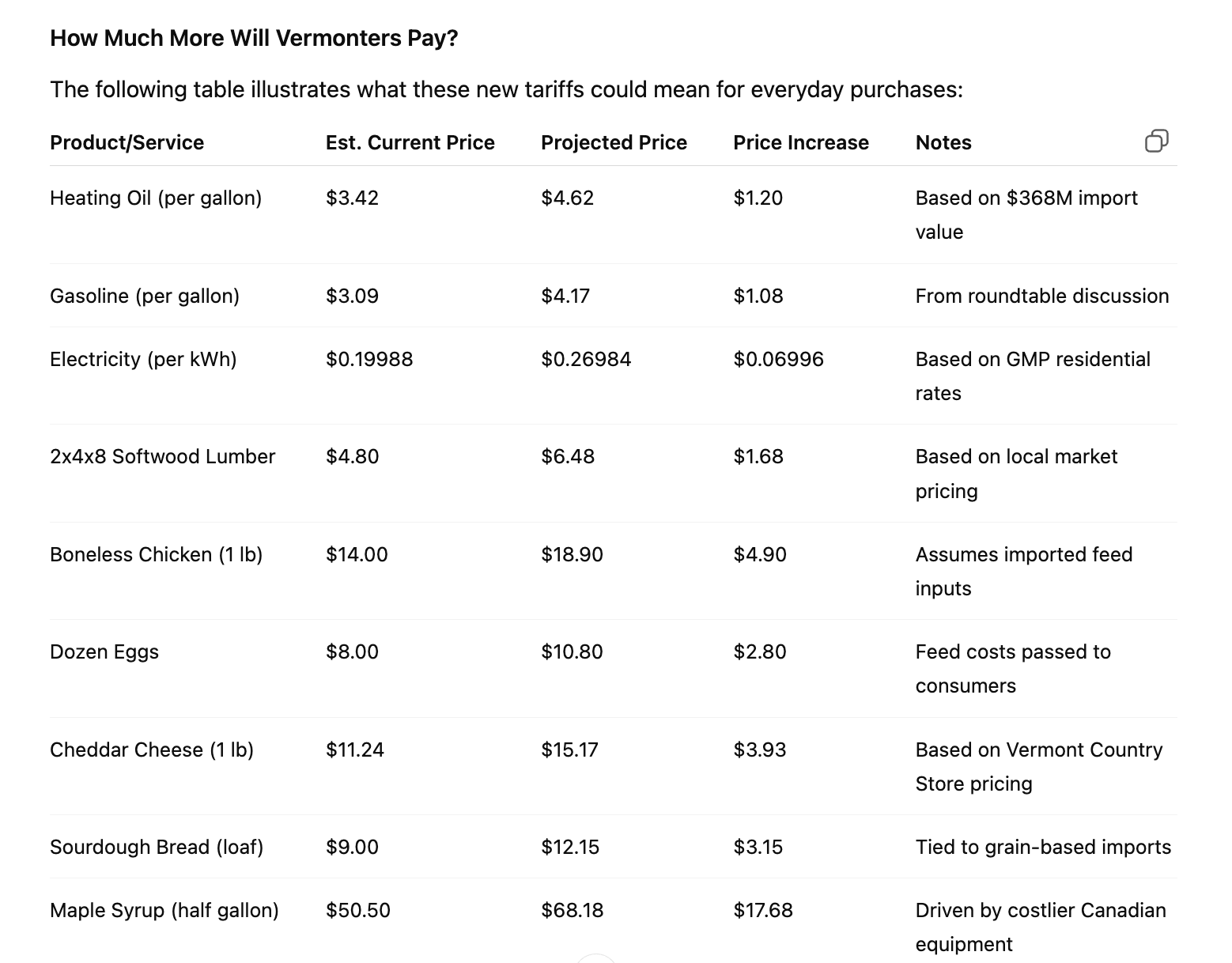 Natural gas, which Vermont imports from Canada at a value of $145 million annually, will also see increased prices. These costs affect residential heating as well as commercial and industrial operations.