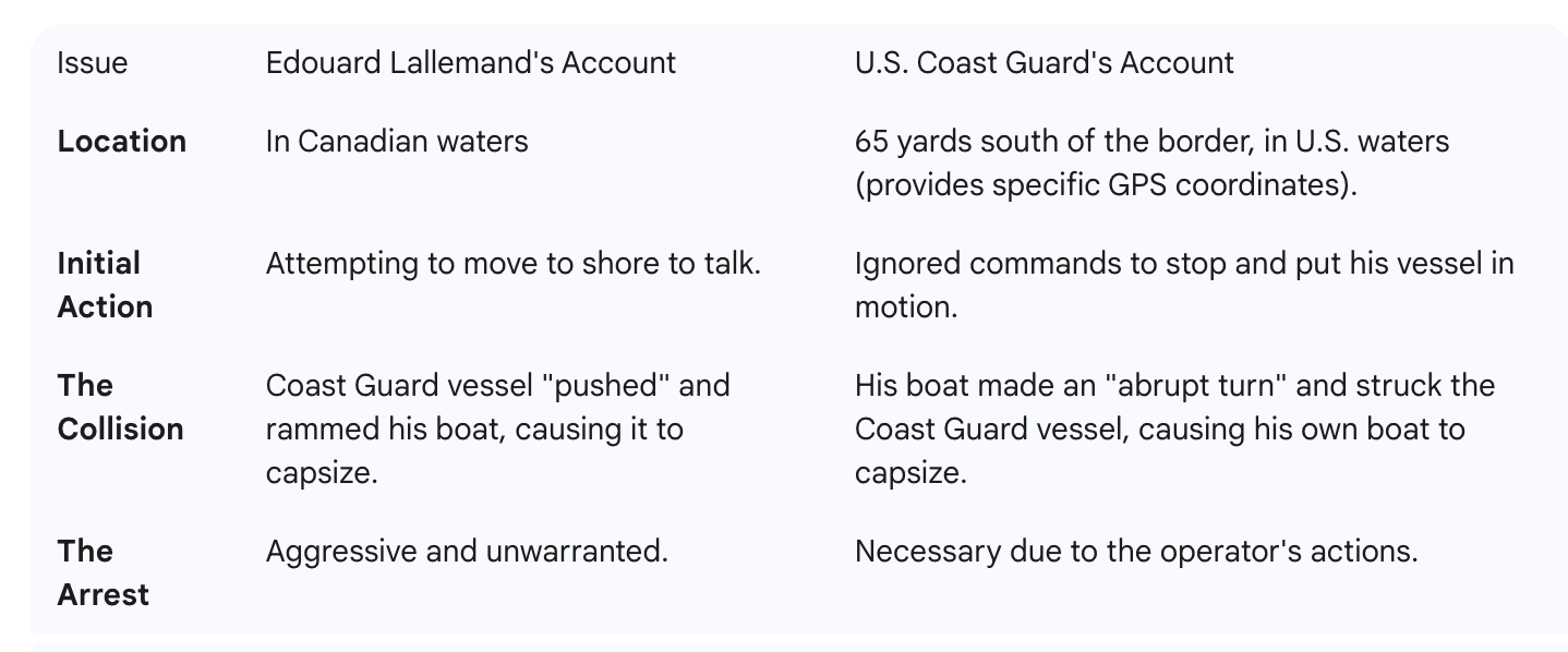 Crucially, the Coast Guard provided precise coordinates for the encounter: 45°00.792'N, 073°10.608'W. According to navigational charts, this position is approximately 65 yards south of the 45th parallel—the international boundary. At this location, the Coast Guard claims, it was Mr. Lallemand’s boat that made an “abrupt starboard turn and struck the port bow of the Coast Guard small-boat,” causing his own vessel to overturn. They have stated his actions are now under investigation.