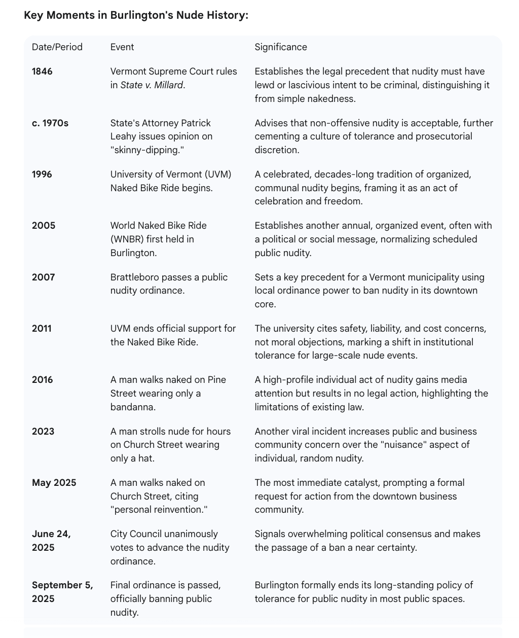 Burlington, with its progressive ethos and counter-cultural leanings, became a natural haven for this legal ambiguity. The city's reputation for quirky individuality embraced forms of public nudity that would raise eyebrows elsewhere.