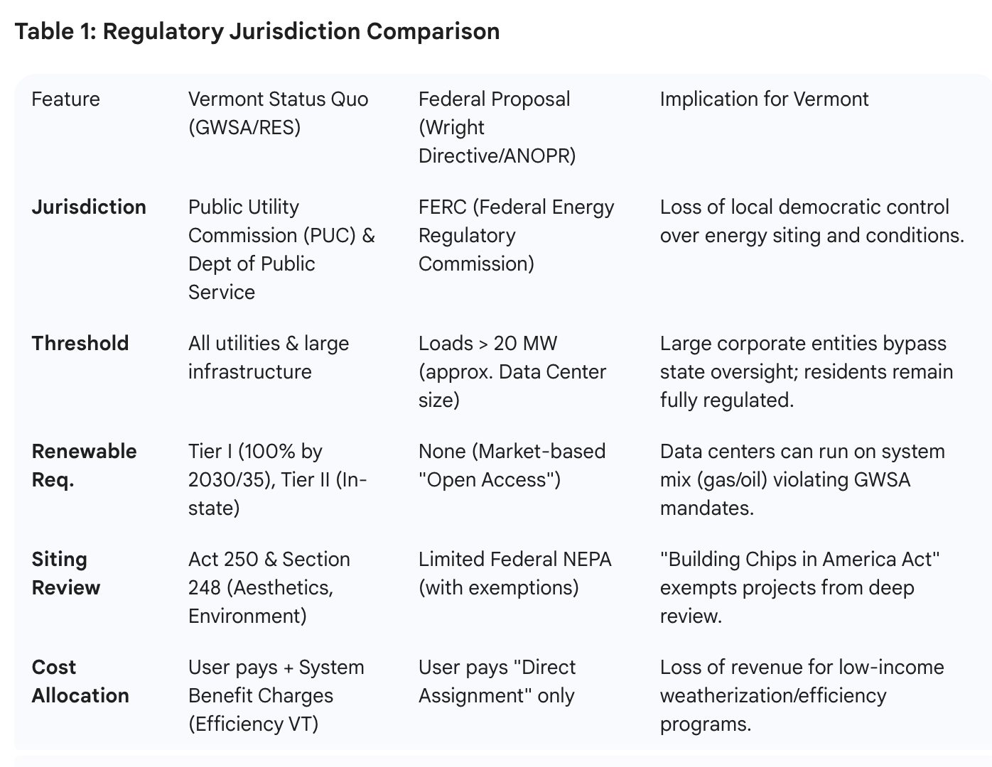 Under the Wright Directive, a similar facility arriving in 2026 could bypass the PUC entirely. It would apply directly to ISO New England (the grid operator) under federal rules. Vermont would lose the leverage to negotiate renewable requirements or community benefits, potentially resulting in a facility that uses non-renewable power while contributing nothing to state efficiency programs.