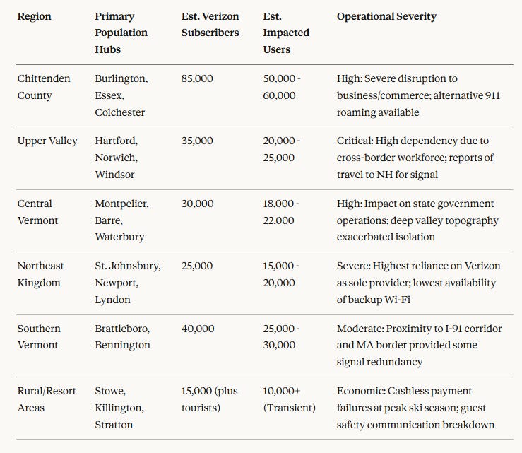 The outage affected Verizon subscribers throughout Vermont, with varying degrees of severity depending on location and the availability of alternative carriers. The following breakdown shows estimated impact across Vermont’s regions: