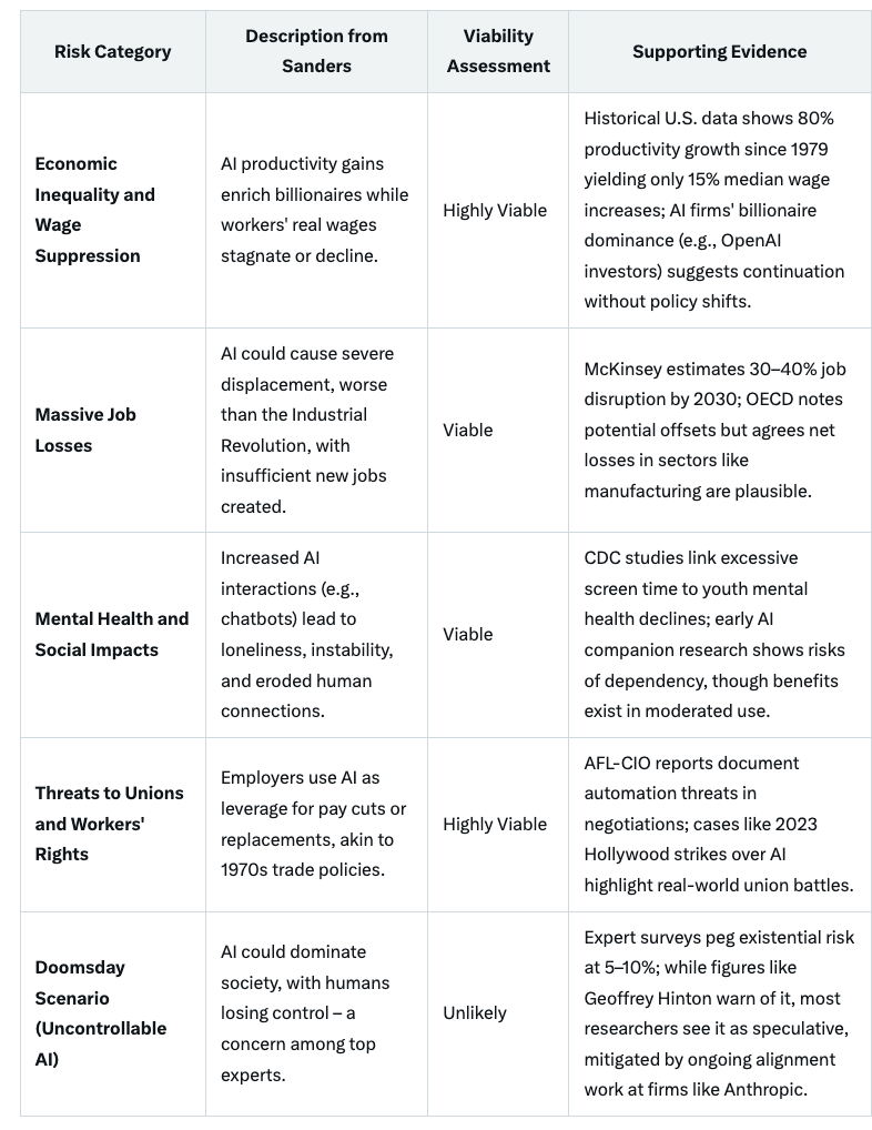 To balance these warnings, it's worth assessing the viability of Sanders' highlighted risks based on recent research from organizations like the Center for AI Safety, McKinsey, and expert surveys compiled by groups such as 80,000 Hours. While Sanders' concerns are rooted in real trends, not all carry equal likelihood. The following table categorizes them, drawing on analyses of historical data, economic projections, and AI safety studies: