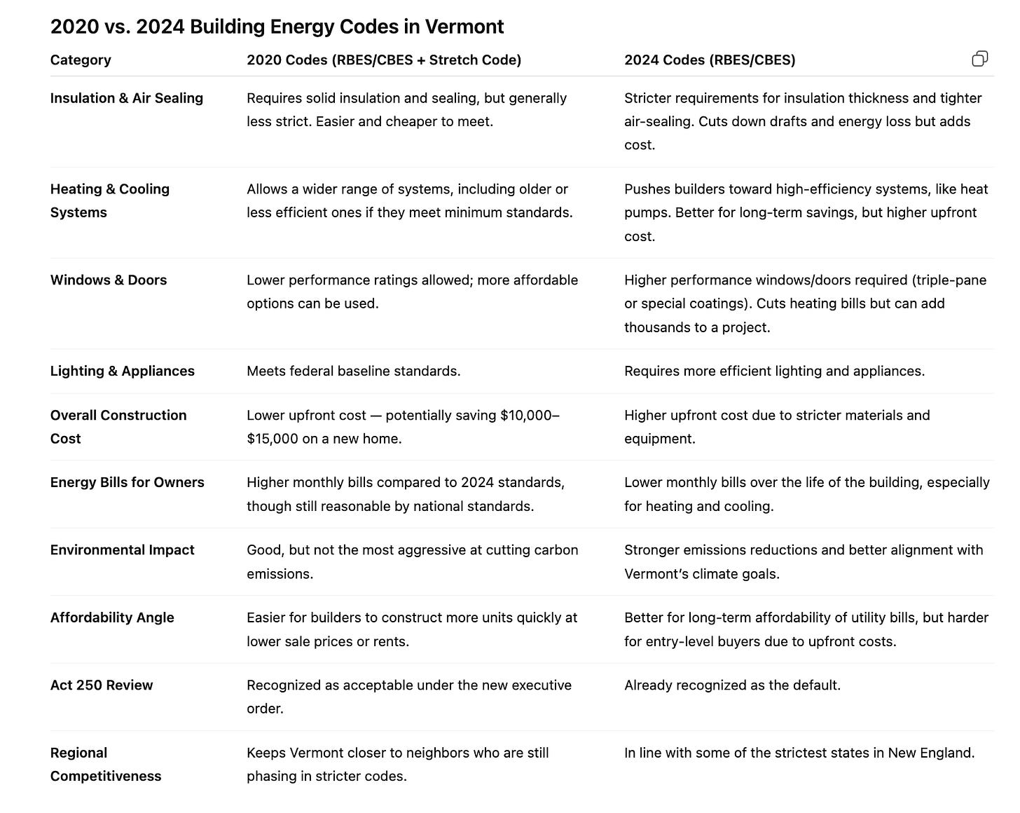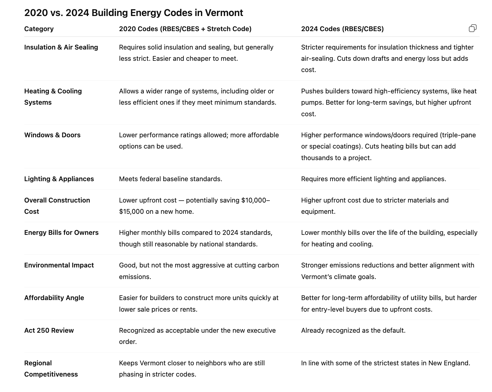 Example: If a contractor is building a new duplex in Barre, they can use the 2020 rules (which are less expensive to meet) instead of the 2024 rules. That could shave thousands off the cost, which might make the units more affordable for buyers or renters.