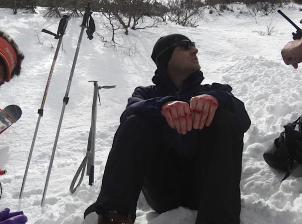 And then we slowed and then we stopped. We were both on the snow, not buried. Tim was only six feet away -- almost within reach. One of my legs was up in the air snagged in the branches of a tree but was still attached to my hip. My body lay across the slope (it was still very steep). Tim was laying up against some trees and was crying out in pain and within seconds lost his vision and began going unconscious. We still had our packs on, but we’d both lost our hats, glasses and axes. I sat up and blood sprayed out of my head onto the snow and my body. We called to each other to confirm the other knew we were each close by.