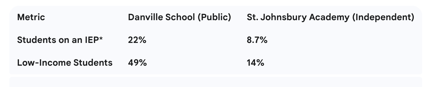 At the core of the debate is a contentious disagreement over which type of school is best equipped to serve all students, particularly those with the greatest needs. A look at the data reveals a stark contrast between Danville School and the two large independent schools that stand to gain its students, St. Johnsbury Academy and Lyndon Institute.