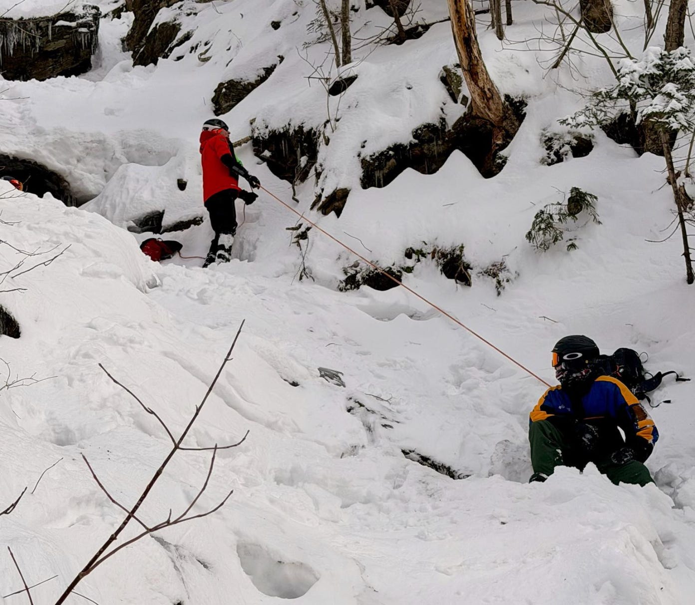 Rescue coordinators sized up the problem and deployed two fully equipped teams simultaneously — one ascending from the bottom via the Notch road by ATV and then on foot; a second riding the Sunny Spruce chair lift and traversing half a mile in snowshoes to approach from above. The terrain required eyes-on assessment before any extraction plan could be committed to. The bottom team reached the men first, climbing up to them and belaying them safely out of the chute.