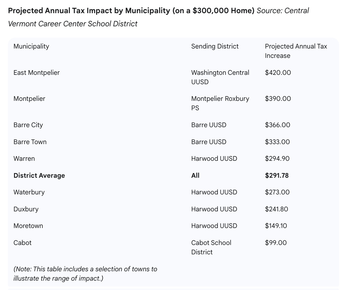 CVCC officials have provided “good faith estimates” for the annual property tax increase on a home valued at $300,000. While the district-wide average is projected to be $291.78, the impact ranges from $99 in Cabot to $420 in East Montpelier—a more than four-fold difference for the same regional facility.