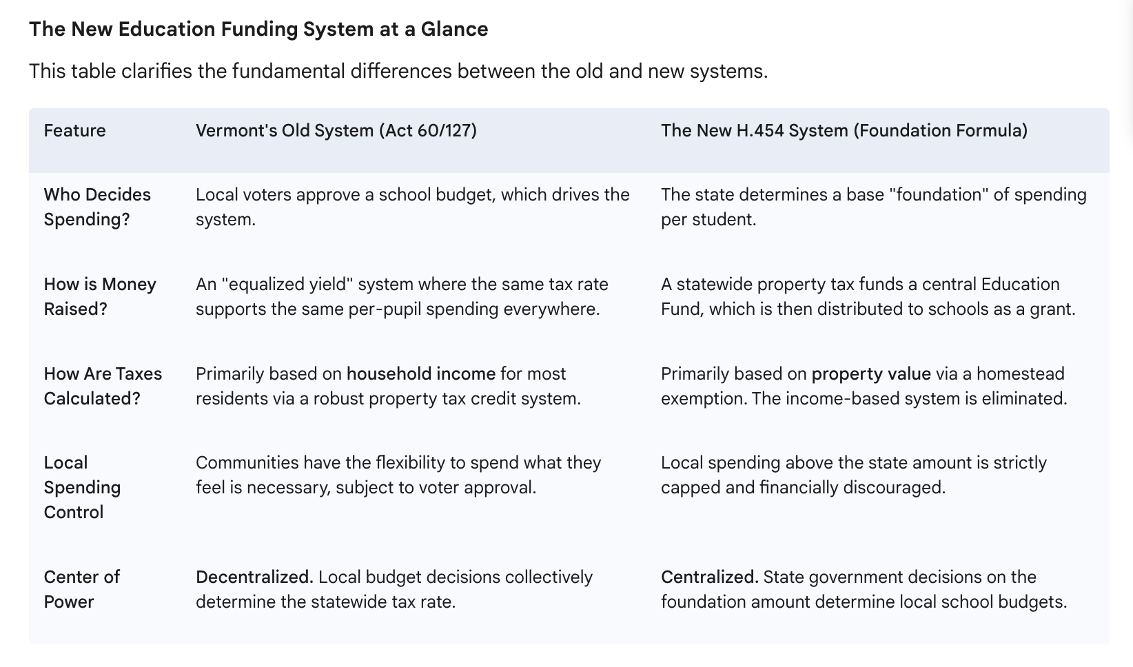H.454 completely dismantles the state's nationally recognized but often controversial funding system, which has been in place since the 1997 Brigham court decision. In its place, the bill erects a new financial architecture controlled at the state level.