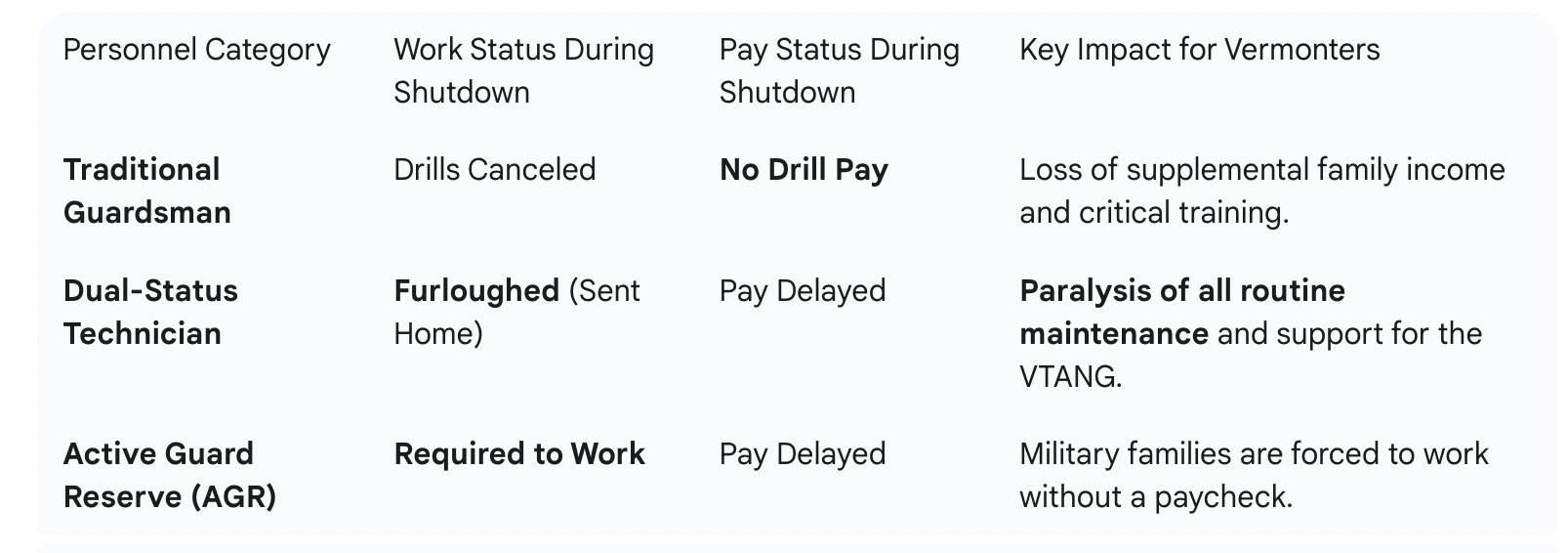 Personnel CategoryWork Status During ShutdownPay Status During ShutdownKey Impact for VermontersTraditional GuardsmanDrills CanceledNo Drill PayLoss of supplemental family income and critical training.Dual-Status TechnicianFurloughed (Sent Home)Pay DelayedParalysis of all routine maintenance and support for the VTANG.Active Guard Reserve (AGR)Required to WorkPay DelayedMilitary families are forced to work without a paycheck.