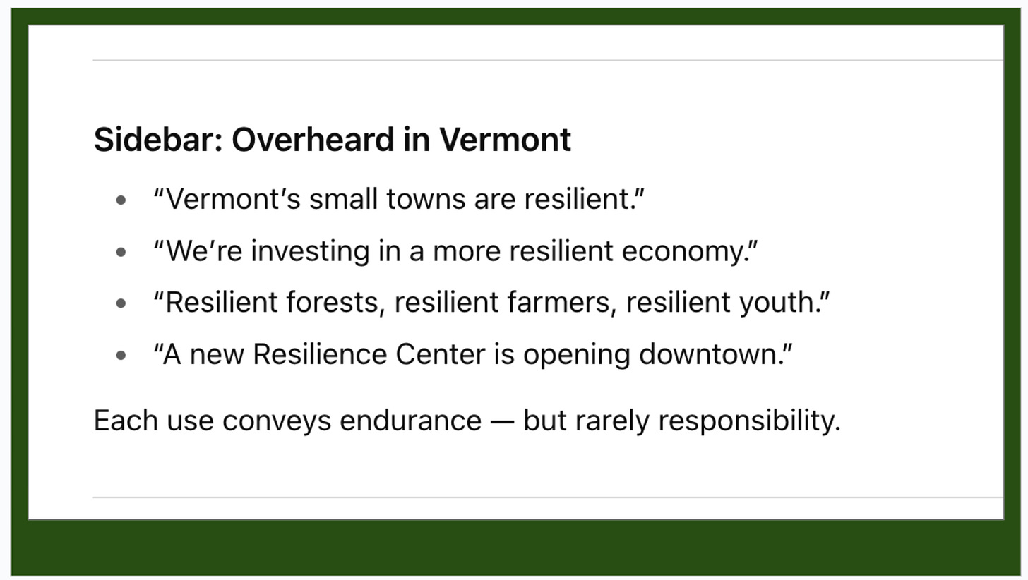Across the country — and across Vermont — the word resilience appears wherever something has gone wrong. Cities draft “resilience plans.” Corporations tout “resilient supply chains.” Even banks issue “resilience reports” after layoffs or scandals.