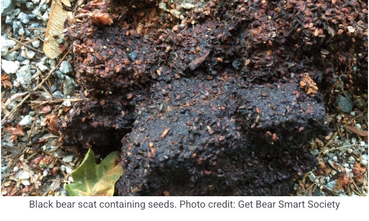 Bears are arguably the most effective seed dispersers in our forests. As omnivores, a huge portion of their late-summer and fall diet consists of fruits and berries. According to the North American Bear Center, a single bear can consume up to 30,000 berries a day. They eat everything from wild cherries and elderberries to raspberries, blackberries, and serviceberries.