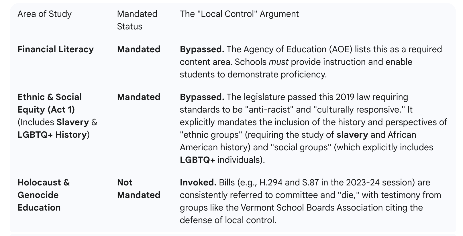 A review of Vermont’s educational requirements reveals a stark inconsistency. While some topics are deemed essential enough to bypass this tradition, Holocaust education has been repeatedly sidelined.