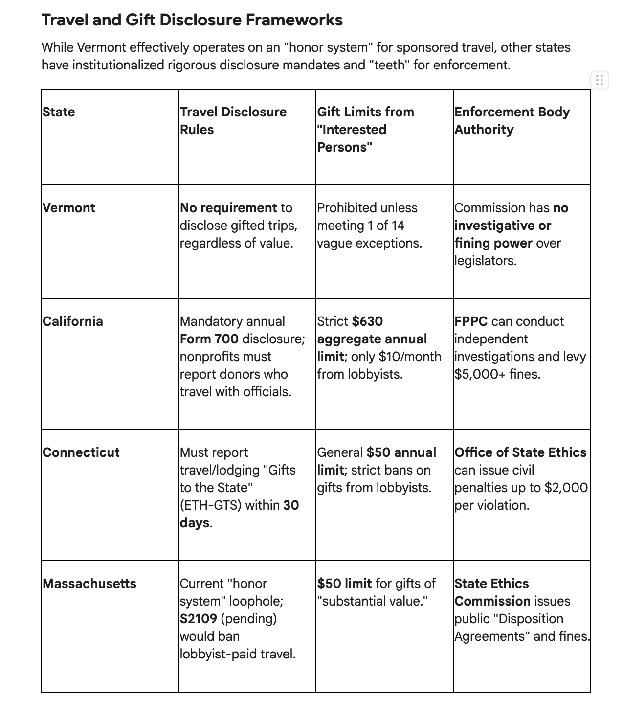 The contrast is especially striking given California’s enforcement track record. The California Fair Political Practices Commission can conduct independent investigations and has levied substantial fines for ethics violations. Vermont’s State Ethics Commission has no such power over legislators.