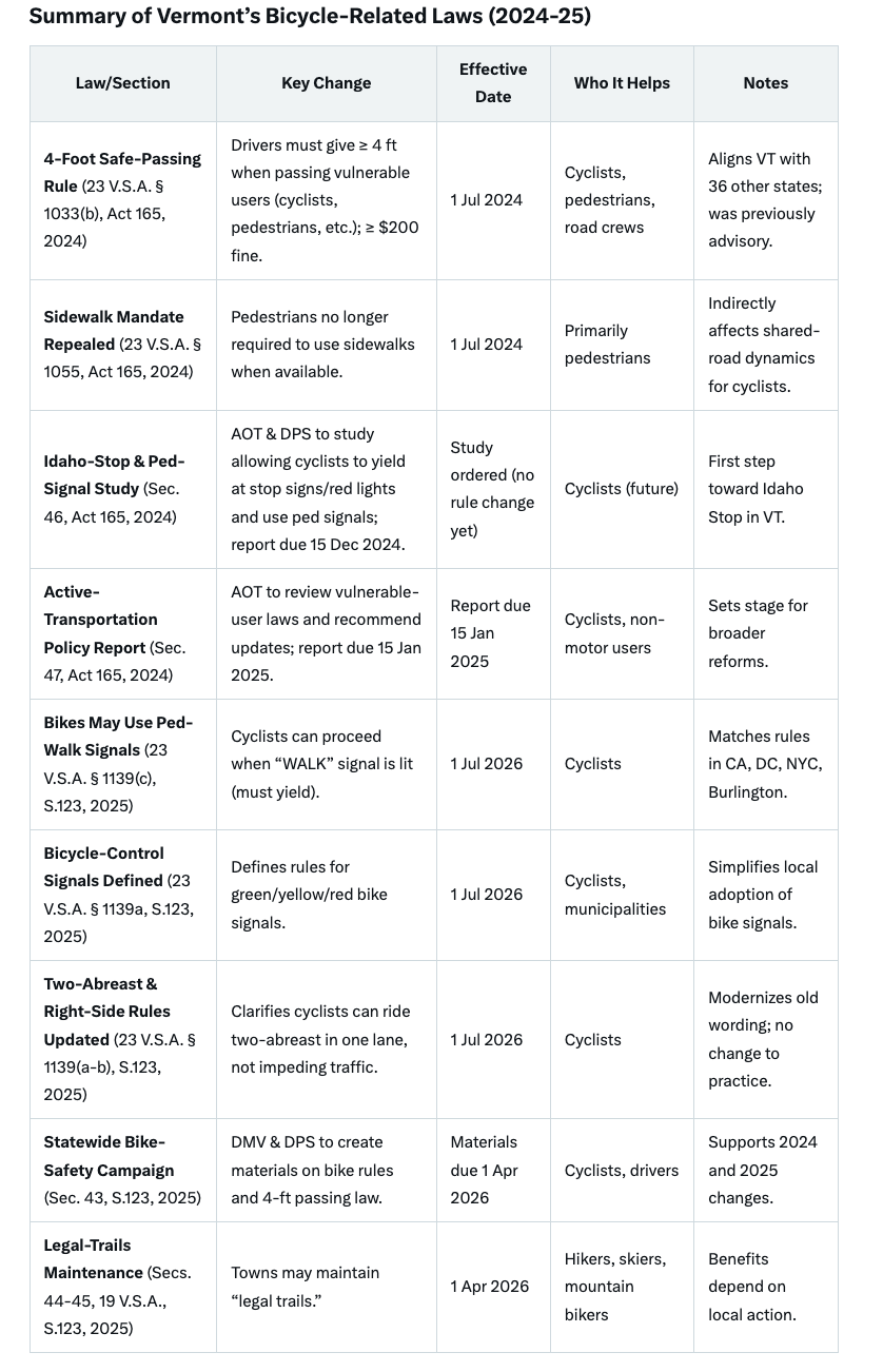 Stronger Safety Protections: A new 4-foot safe-passing rule requires drivers to give cyclists at least 4 feet of space when overtaking, with a minimum $200 fine for violations. This codifies what was previously just advisory, aligning Vermont with 36 other states.
