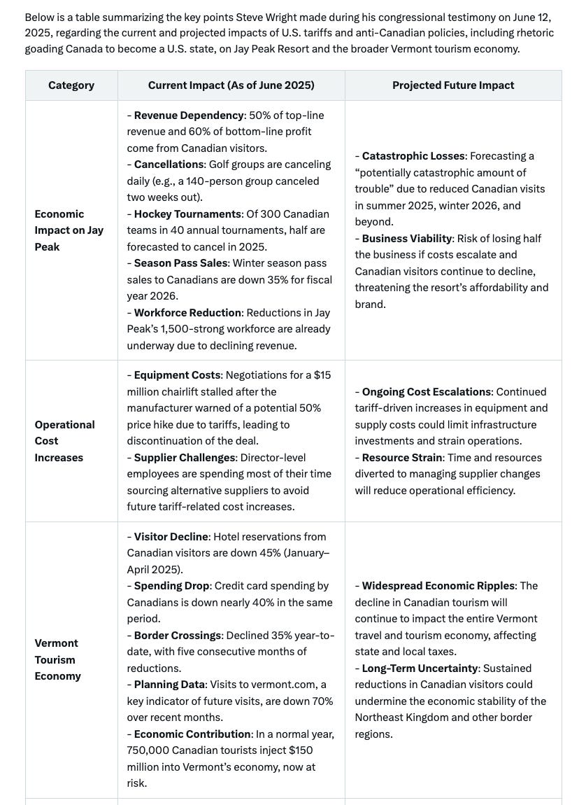 In a compelling testimony before Congress, made possible by an invitation from Vermont Senator Peter Welch, on June 12, 2025, Steve Wright, president and general manager of Jay Peak Resort in Northern Vermont, sounded the alarm on the devastating impact of U.S. tariffs and anti-Canadian rhetoric on his business and the broader
