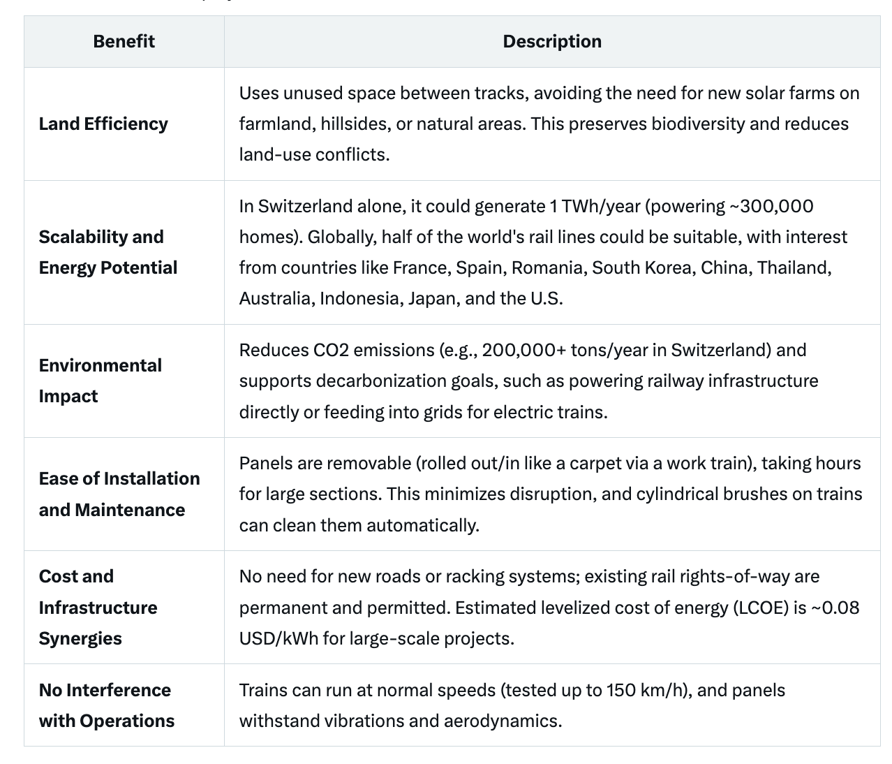 Rail-solar ducks those darts: Tracks are already "industrial," tucked away from backyards, and the panels lie low, out of sight from most vantage points. No extra disruption, no habitat loss—just piggybacking on space we've already claimed.