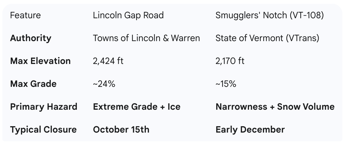 As the comparison shows, the number one threat on Lincoln Gap is ice. The first hard freeze of autumn, which can easily happen in mid-October at 2,400 feet, can create a thin, invisible layer of black ice. On a 24% grade, this would make the road lethally slick. The October 15th date is set to proactively prevent this specific, catastrophic scenario.
