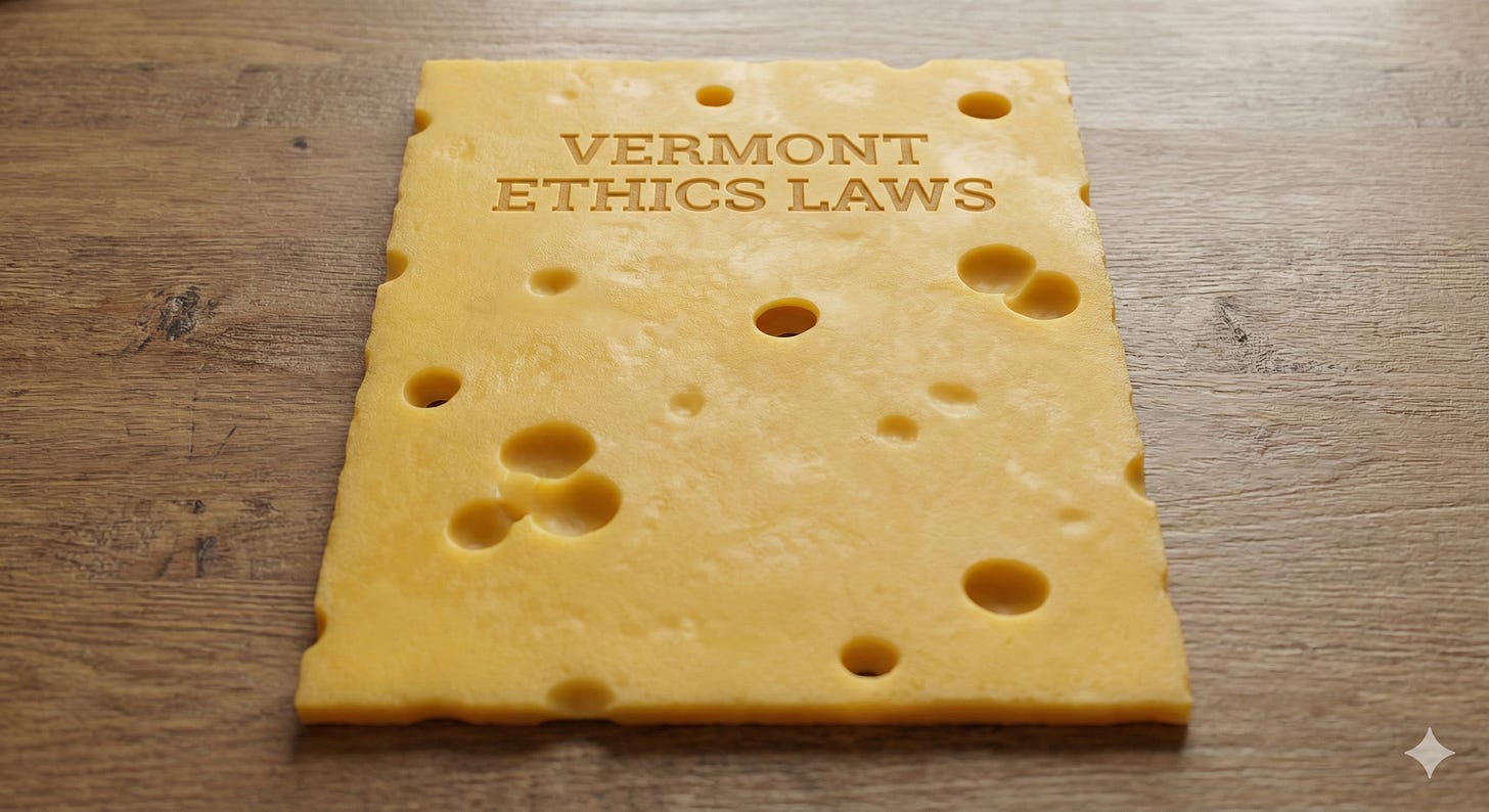 Vermont’s ethical framework is known as the “Swiss Cheese Model”—a system that is riddled with structural voids. These holes allow conduct that is strictly regulated or prohibited in other states.