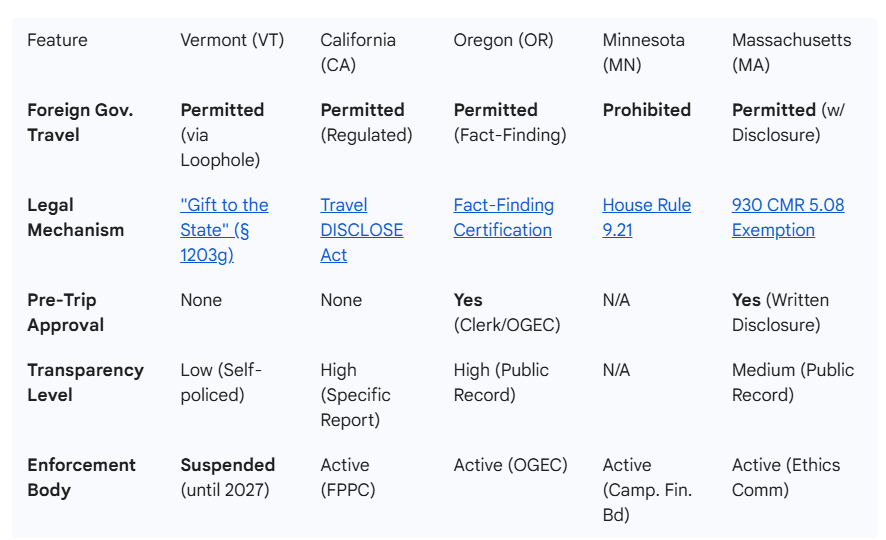 As the table illustrates, Vermont stands alone in combining a permissive legal environment (”Gift to the State”) with a suspended enforcement mechanism. In Minnesota, the trip would have been a violation of the gift ban. In California, it would require a specific disclosure report. In Vermont, it sits in the gray area of the “Swiss cheese.”