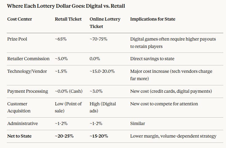 The state’s margin on a digital lottery dollar can actually be thinner than on a retail dollar. The financial logic relies on volume, not margin—the belief that online players will wager more frequently, at all hours, capturing spending when people don’t want to drive to stores.