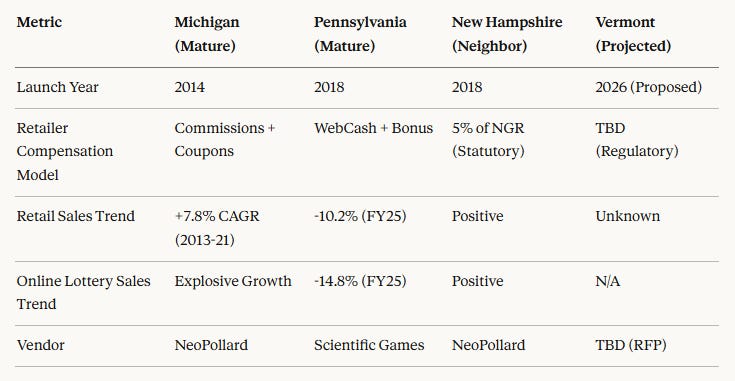 The debate centers on a choice shaped by two very different stories: Michigan’s explosive growth where everyone benefited, and Pennsylvania’s recent simultaneous decline across all channels. Vermont lawmakers must decide which story better predicts their state’s future—and whether the potential revenue justifies the risks of market saturation, retailer displacement, and expanded problem gambling in an uncertain economic climate.