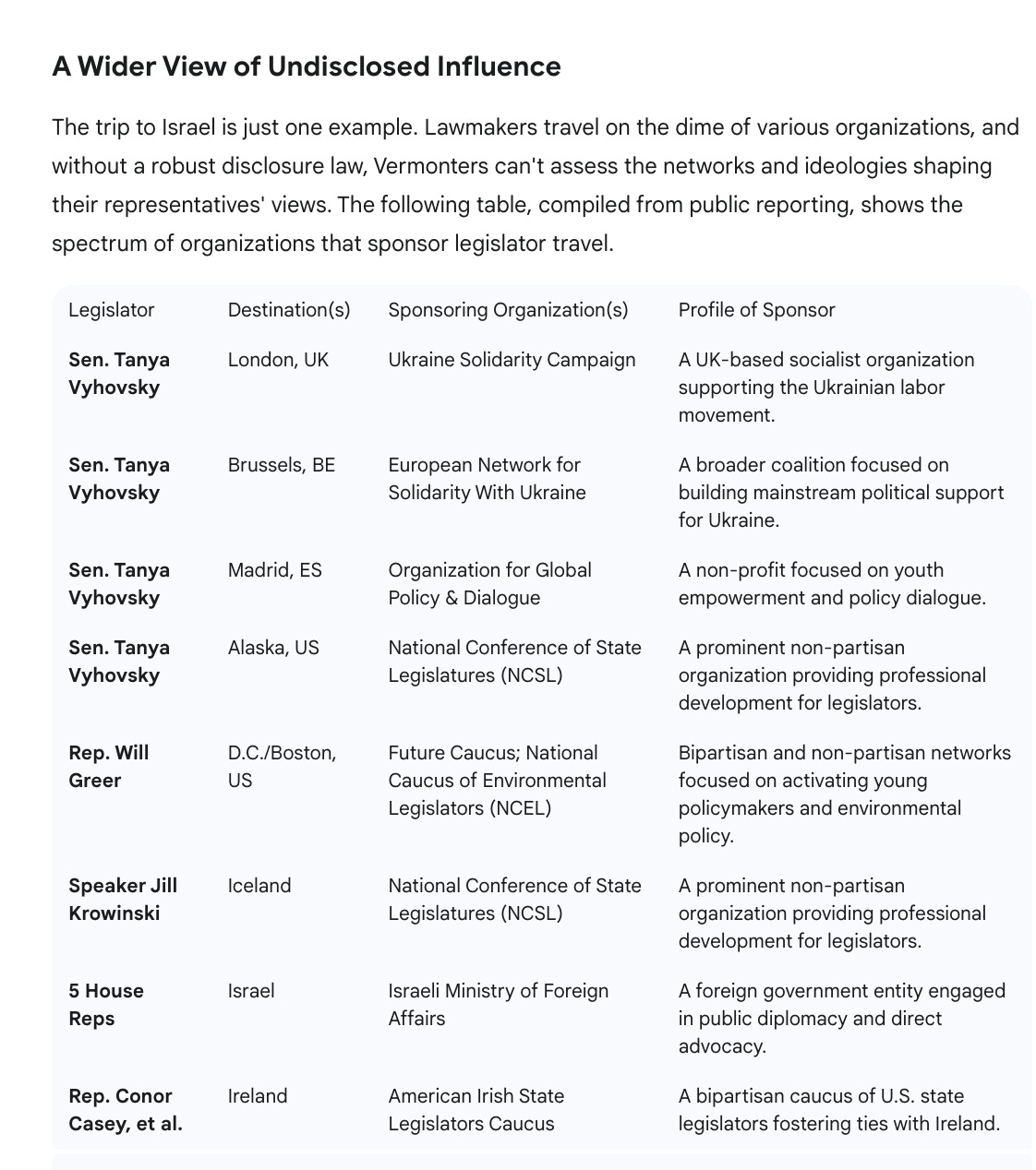 The Geopolitical Context: The trip occurred at a highly charged moment. Just one day before, an independent United Nations commission released a report concluding that Israel was committing genocide in Gaza, an accusation echoed by all three members of Vermont’s own federal delegation. The decision to accept a government-sponsored trip at the very moment that government was facing such serious accusations from international bodies and the state’s own representatives is the core of the public controversy.